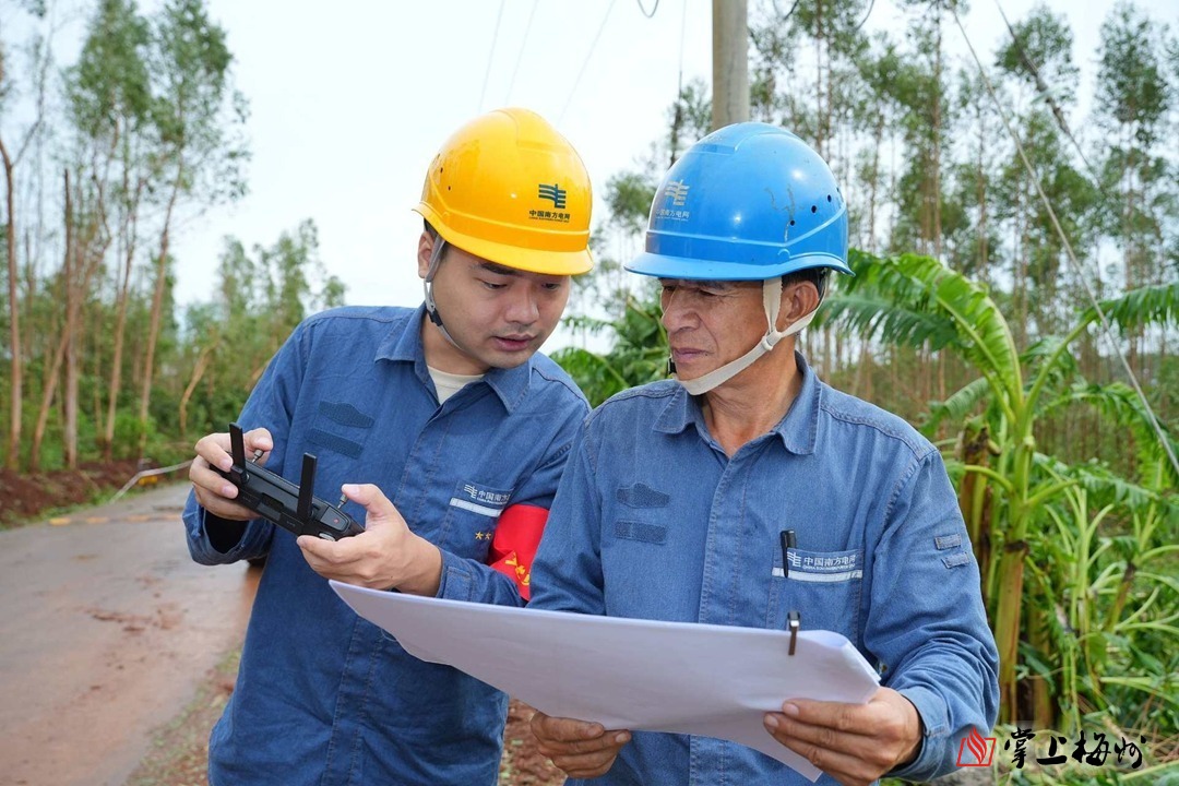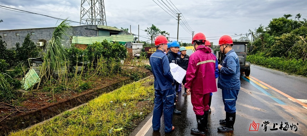 10月6日上午,梅州兴宁供电局抗灾指挥部随同雷州雷高供电所,对受损线路进行现场勘查、巡视、分工。(陈祖康 摄)