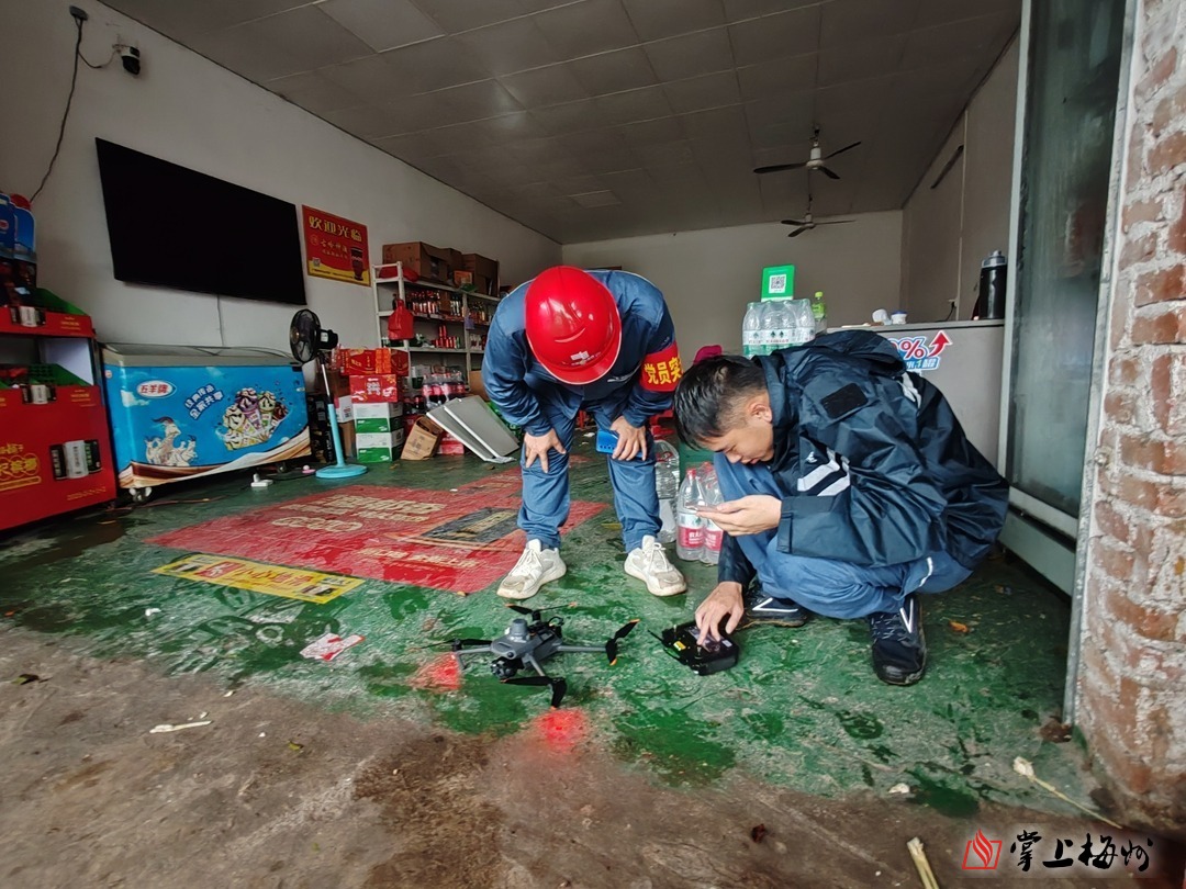 平远供电局抢修复电人员利用无人机对因灾受损线路开展故障巡视。(谢洪浪 摄)